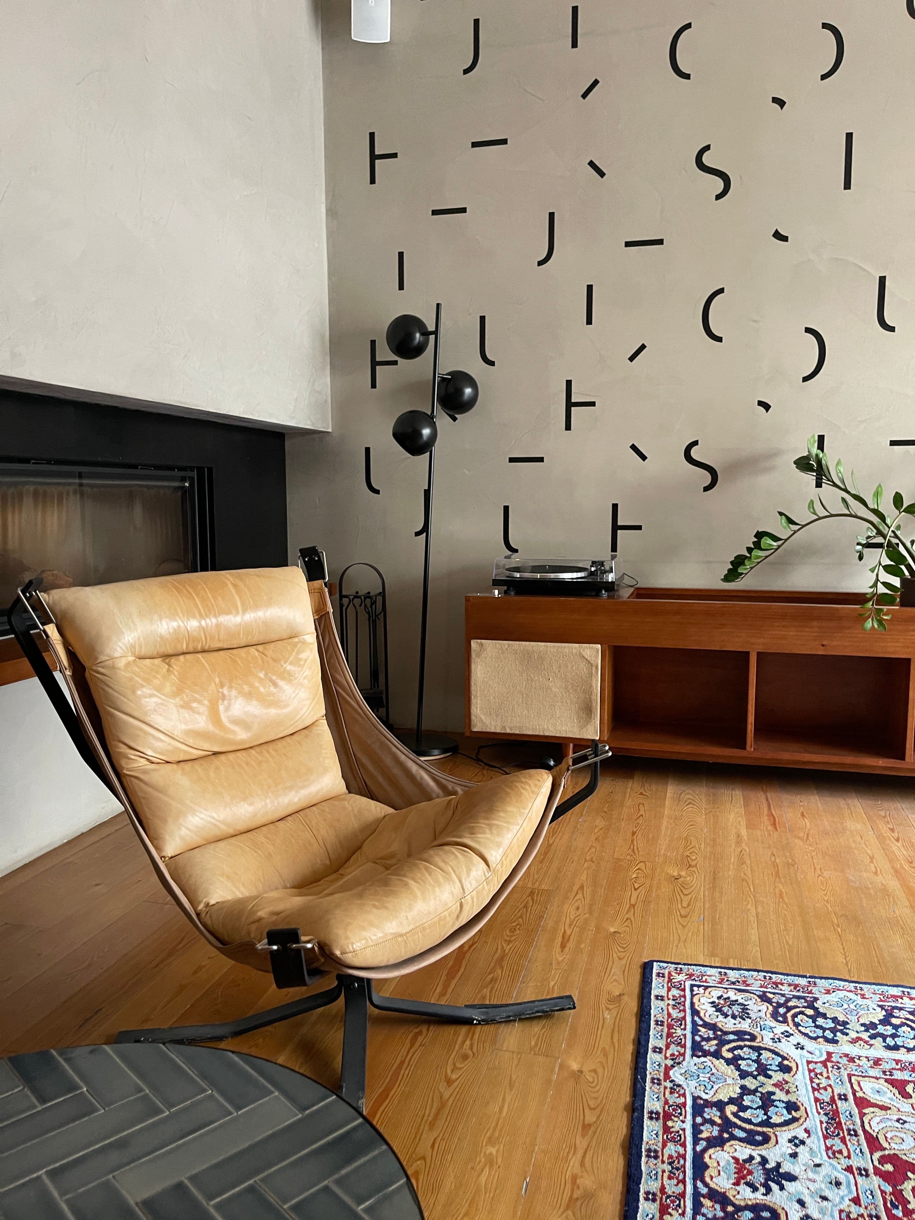 The sofa, with its generous curves, invites you to sink in. Its rich texture catches the light, while the dark, elegant fireplace adds an almost architectural presence. Between the two, the wood acts as a bridge, linking materials and softening contrasts.