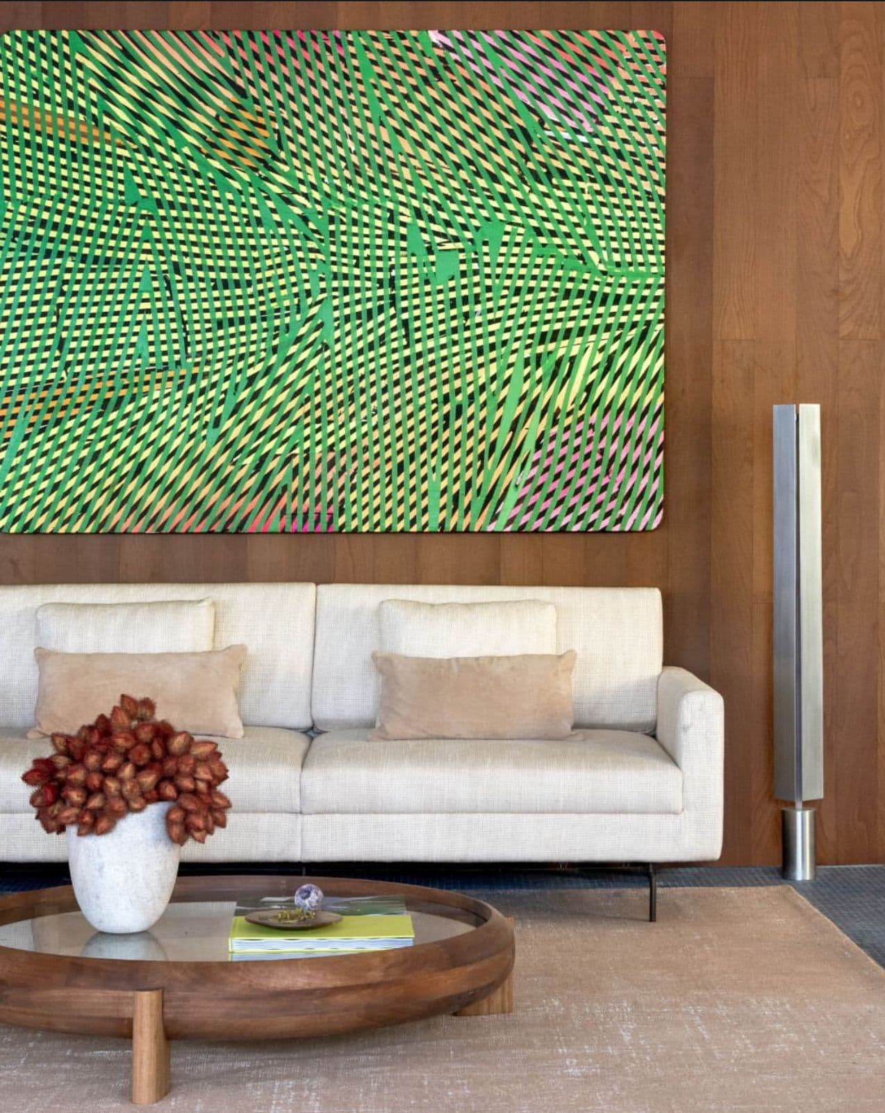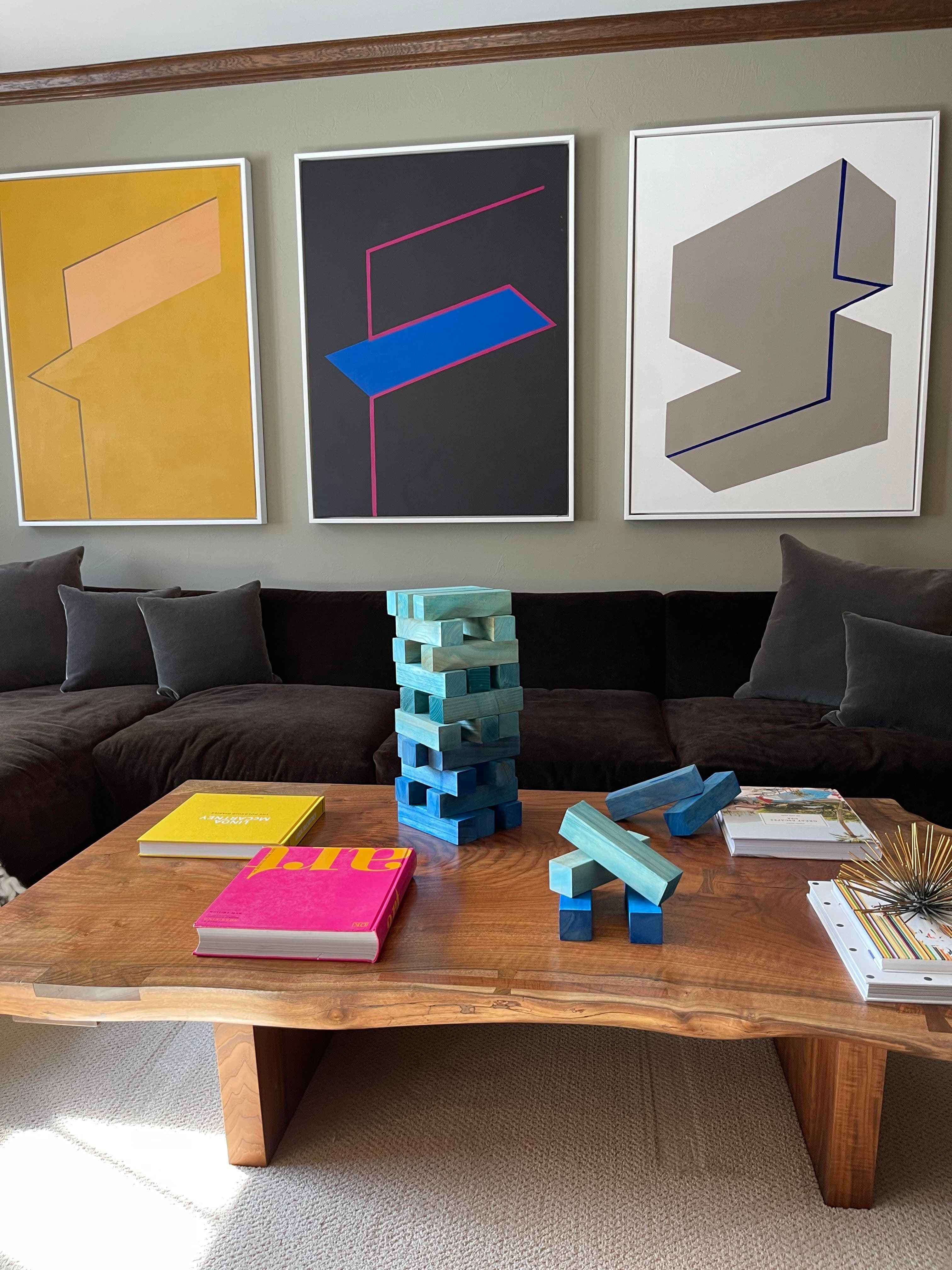Take this interior, for example: three bold geometric artworks in distinct yet unified tones, a stack of colored wooden blocks reminiscent of both childhood and contemporary art, and a raw wood coffee table grounding the entire composition in organic truth. Every detail seems chosen not to impress, but to express.