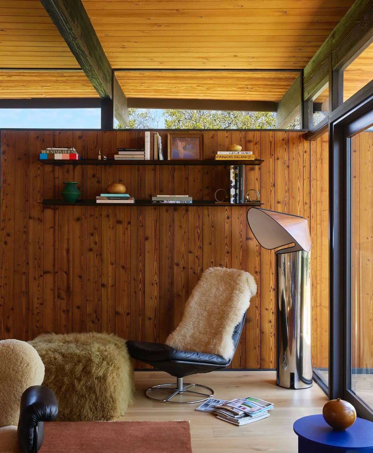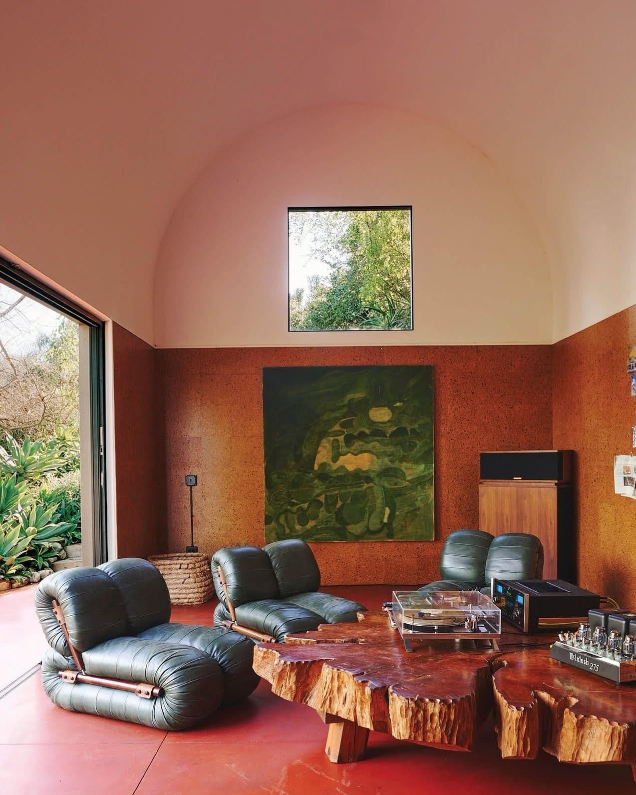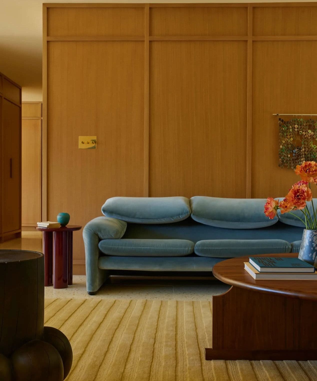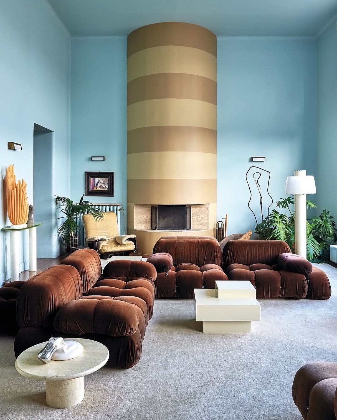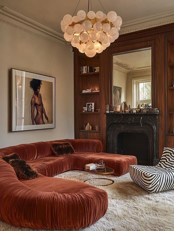 In this living room, nothing is left to chance. Color isn’t just there to look pretty it sets the tone, shapes the mood, and defines the space. Three hues dominate and hold the room together with authority: the deep rust of a velvet sofa, the mineral black of a marble fireplace, and the warm brown of the wood paneling. No excess. Just the essentials, chosen with precision.