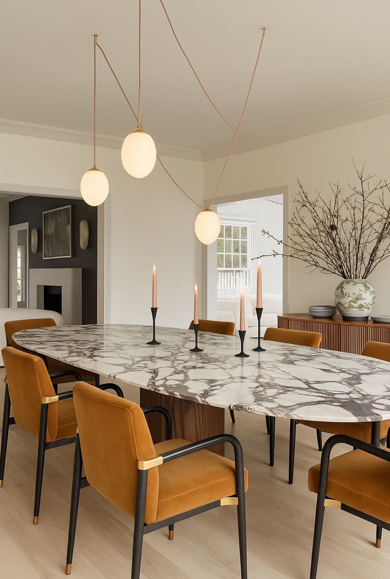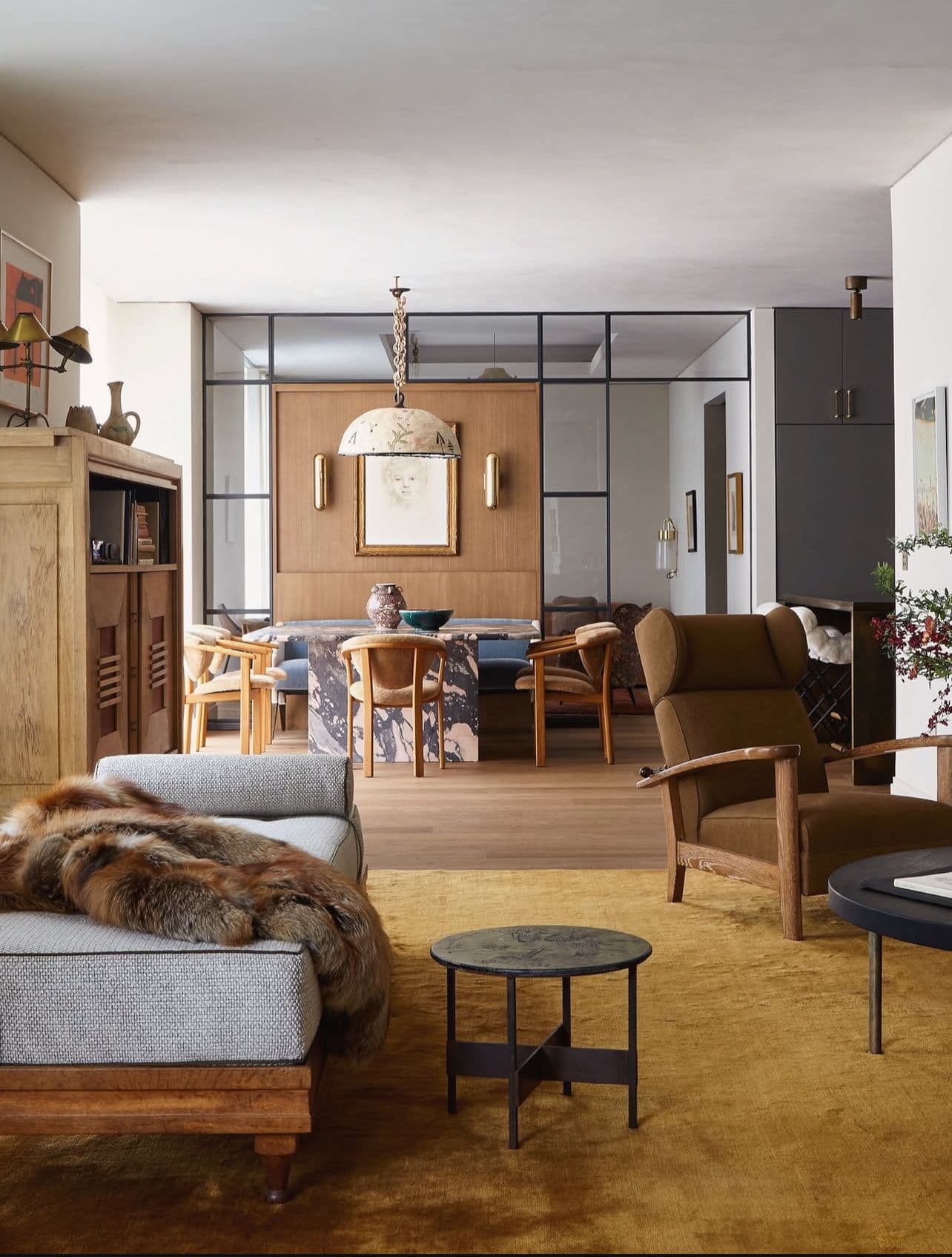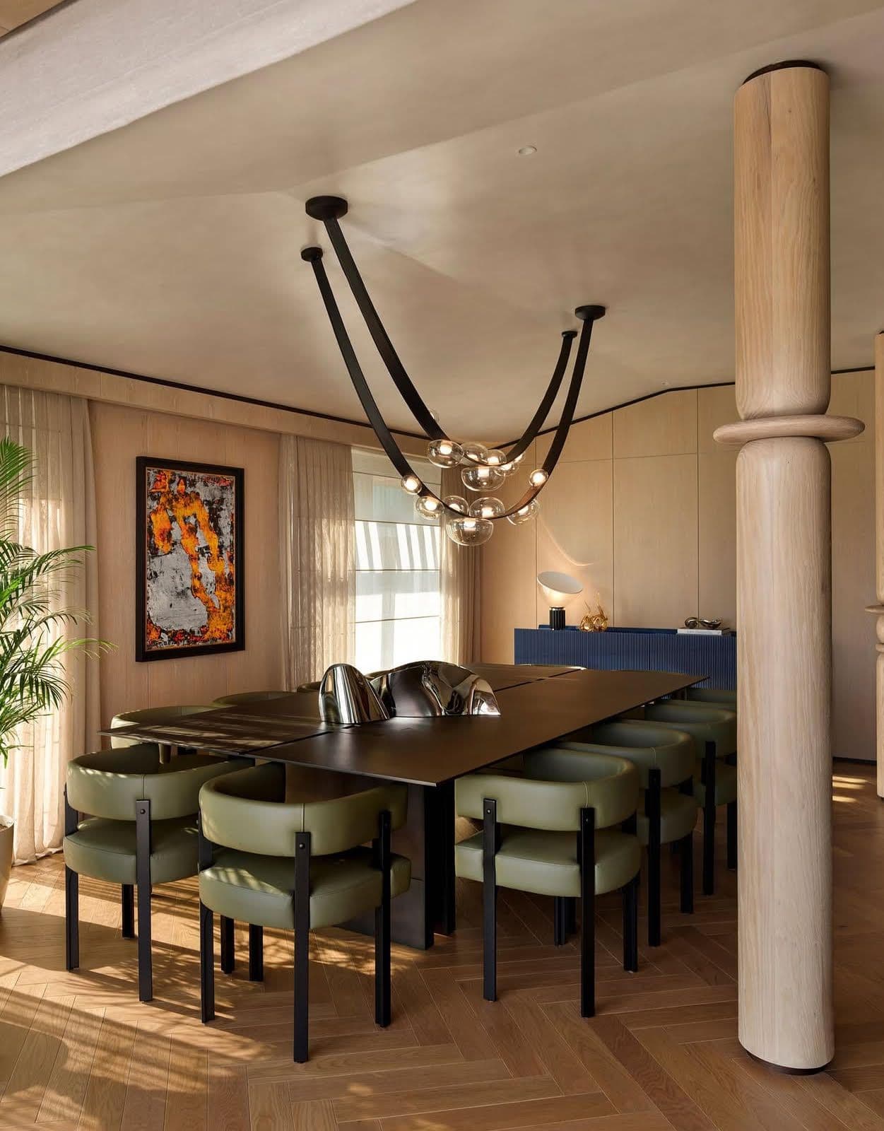 This dining room is not simply a place to gather; it is a stage where architecture, art, and design converge to create atmosphere. Every element from the sculptural chandelier to the tactile wood column works in harmony, transforming the act of dining into an immersive experience.