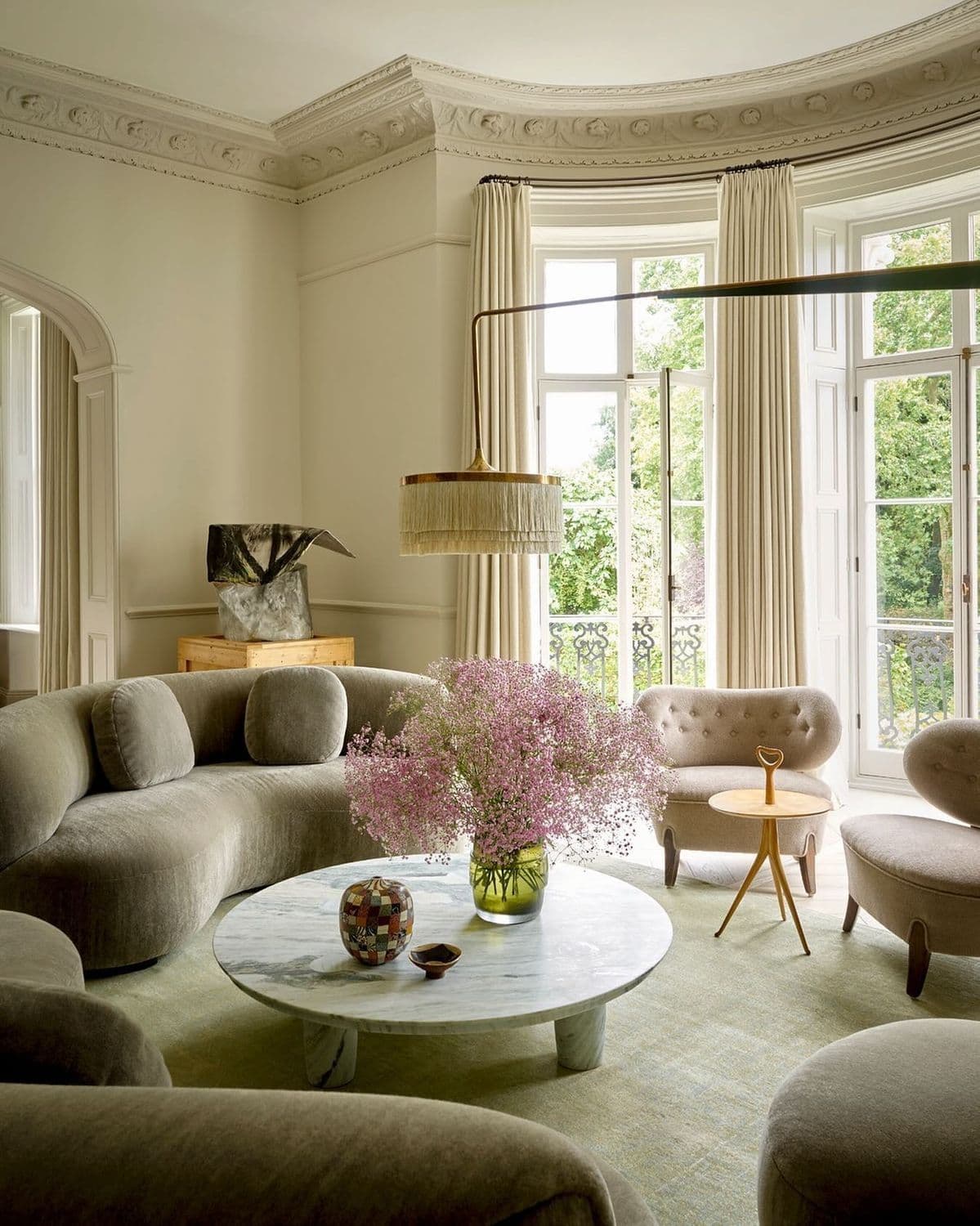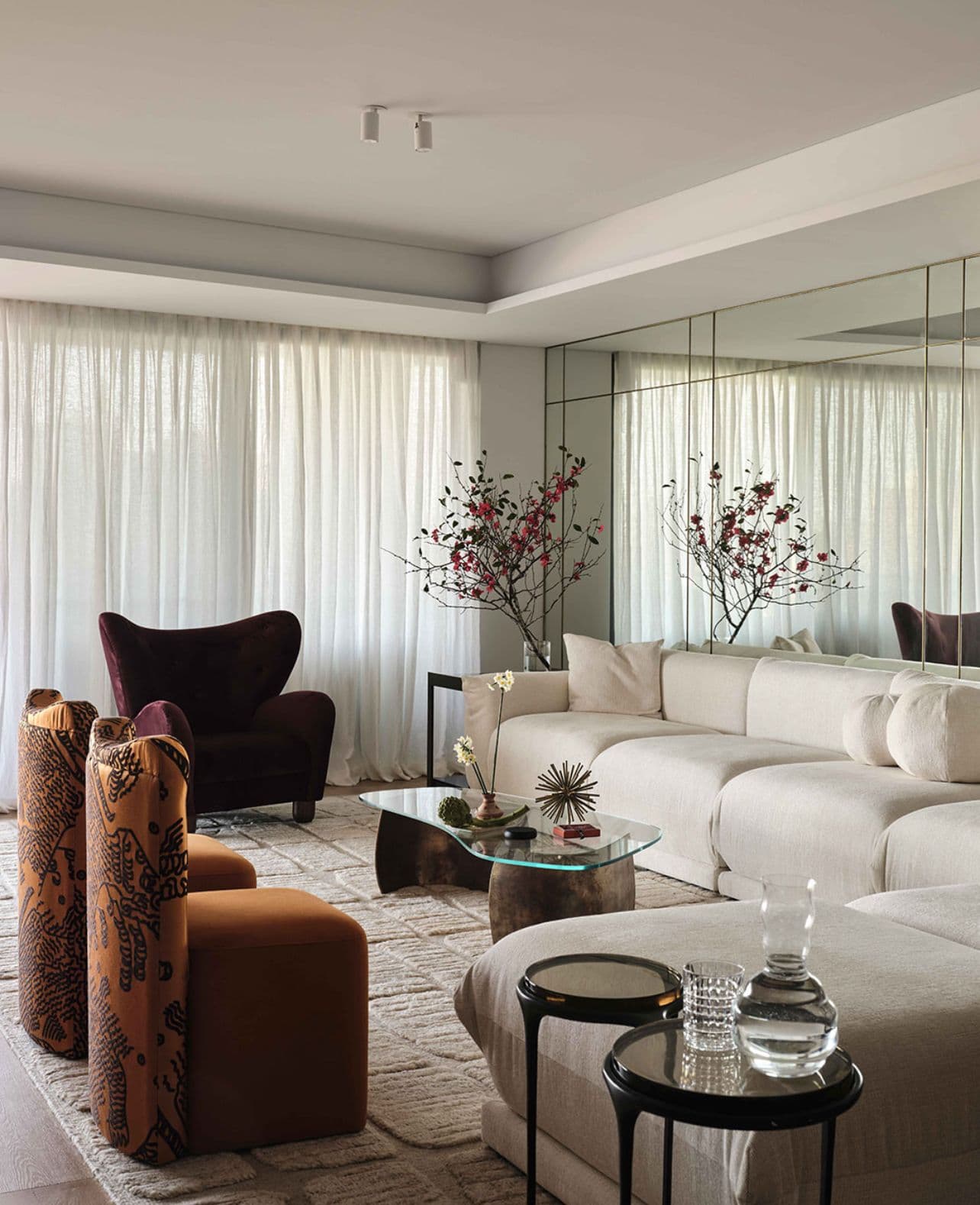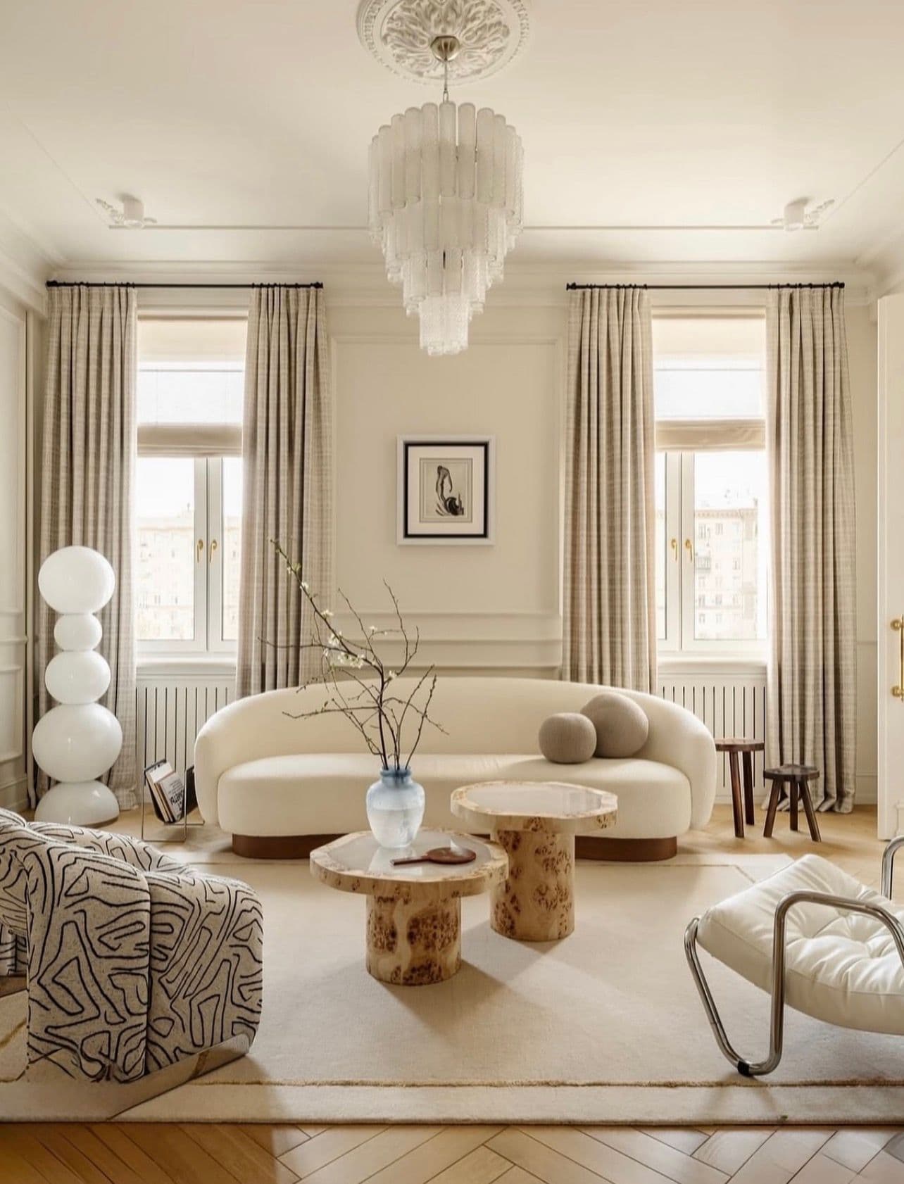 In this living room, elegance emerges not from excess, but from the quiet dialogue between textures, tones, and forms. The space, bathed in natural light diffused through sheer curtains, feels at once serene and sculptural proof that restraint, when curated with intention, can be profoundly expressive.